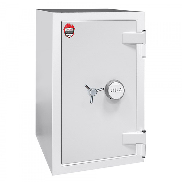 Корпус і двері сейфа заповнені спеціальним вогнестійким бетоном. Товщина захисного шару складає 72 мм. Разом із електронним кодовим замком M-LOCKS це створить суттєву перепону для зловмисника. Замикання здійснюється ригельною системою чотиристоронньої дії. Товсті обертові ригеля діаметром 25 мм забезпечать практичний захист від можливості їх перепилювання. В білому кольорі сейф відмінно доповнить будь-яке сучасне приміщення та не буде виділятись.