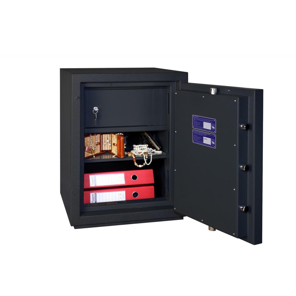 Український виробник ПАРИТЕТ-К є одним із найкращих та найпрогресивніших в сфері проектування та виготовлення сейфів будь-якої категорії. Дана модель GRIFFON CL II.68 K відноситься до вогнезламостійких. Вона здатна захищати цінності від зламу (ІІ клас по EN 1143-1) і дії вогню (клас LFS 30 P). Це означає, що під час пожежі протягом 30 хвилин температура всередині сейфу не підніметься вище 170°C, чого достатньо для збереження паперових документів. Для надійності кріплення передбачені отвори для анкерних болтів. Це дозволить закріпити його до підлоги.