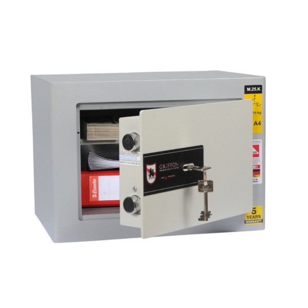 Український виробник ПАРИТЕТ-К є одним із найкращих та найпрогресивніших в сфері проектування та виготовлення сейфів будь-якої категорії. Дана модель GRIFFON M.25.K володіє компактними розмірами і при цьому досить містка для побутових потреб. Її без проблем можна розмістити всередині меблів. Для надійності кріплення передбачені отвори для анкерних болтів. Це дозволить закріпити сейф до підлоги або стіни. При цьому він сертифікований за класом зламостійкості S1. Це означає, що сейф добре протистоїть вандальному зламу.