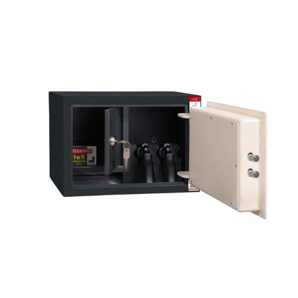 Внутрішній простір має розміри: 244 мм по висоті, 344 мм по ширині і 205 мм по глибині. Всередині міститься ложемент для 2-х пістолетів. Полиць немає, проте є окремий касовий трейзер, який можна зачинити на ключ. Він використовується для зберігання патронів.