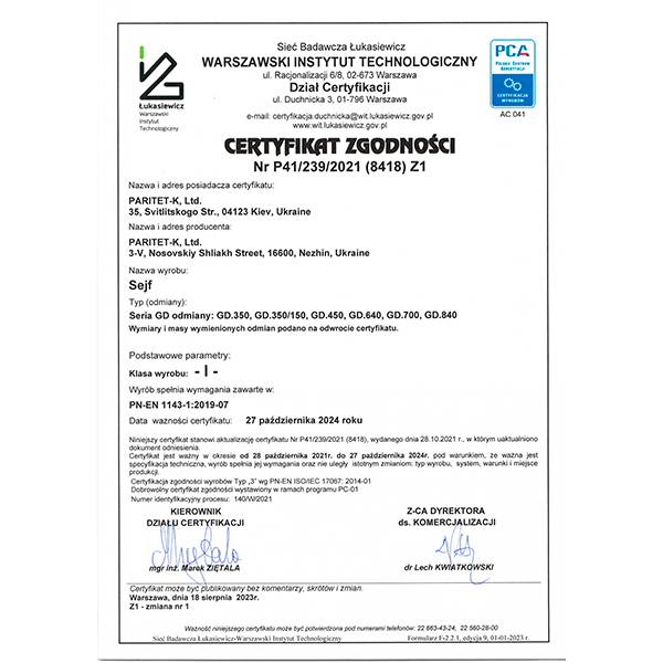 Корпус і двері сейфу виготовлені з металу. Товщина захисного шару стінок складає 20 мм. Сталеві леговані пластини використовуються для захисту від висвердлювання і вибивання замків та ригелів. Є антизламна конструкція "зачіп", яка унеможливлює відкриття дверей гострим предметом або викруткою. Разом з основним електронним кодовим замком Wittkopp (Німеччина) надає вагомий бар'єр для зловмисників. Замикання виконується ригельною системою, а товсті обертові ригеля діаметром 25 мм забезпечують практичний захист від можливості їх перепилювання.