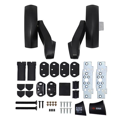 CISA 59011.10 – це антипаніка накладного монтажу із серії Fast Push. Має 3 точки замикання – основний язичок (защіпка) та комплект защіпок вверх-вниз CISA 07063.61, тому не потребує окремого врізного замка. За потреби основний язичок можна заглушити комплектною заглушкою і використовувати лише 2 точки замикання. Загалом комплект включає в себе 2 механізма із защіпками (язичками), трос, спеціальний короб для нього та основний механізм антипаніки.