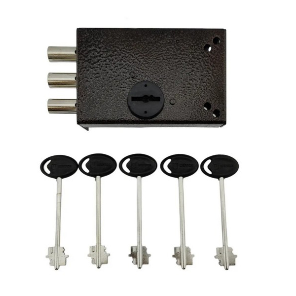 Замок покритий фарбою коричневого кольору, яка вдало протистоїть дрібним подряпинам. Це забезпечить гарний зовнішній вигляд протягом великого періоду часу. Зворотня планка не входить в комплект.