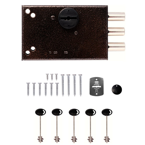 Дана модель універсальна – призначена для дверей як лівого, так і правого відкривання. Керується сувальдним ключем довжиною 110 мм. Він приводить в дію 3 круглих сталевих ригеля діаметром 14 мм. Повний їхній вихід становить 26,5 мм.