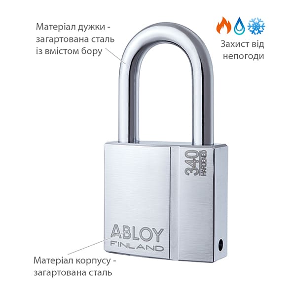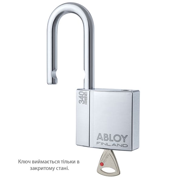 Модель фінського навісного замка ABLOY PL340 Protec 2 з довгою дужкою має гартовані стальні корпус і дужку, завдяки чому спеціалісти відносять його до замків 4-го класу захисту. Використовують його для закривання різного роду складських приміщень, гаражів, трейлерів, в тому числі, тих, які розташовуються на вулиці. Додатково на відміну від замка ABLOY PL340 Protec 2 довга дужка дає можливість ставити замок в тих місцях, де недостатньо розмірів стандартної. Керується замок високосекретним циліндром ABLOY Protec 2, який захищений від злому методом бампінга, відкриття відмичками та від несанкціонованого дублювання ключа. Закривається замок дисковим ключем.
