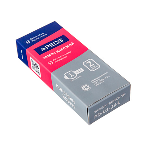 Серія китайських навісних замків APECS PD-01 LONG. Призначається для використання на вулиці та в середині приміщення. Корпус виготовлений із чавунного сплаву, а дужка із сталі. Фіксація дужки відбувається з двох сторін, таким чином цей замок має більшу стійкість до силового злому. Навколо дужки також знаходяться гумові кільця, які перешкоджають потраплянню вологи у замок. Шляхом натискання на дужку, такий замок можна закрити автоматично, не використовуючи при цьому ключ. Наявність подовженої дужки дозволяє використовувати на ширших або нерівно розставлених навісах