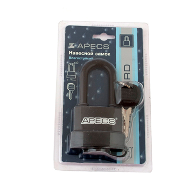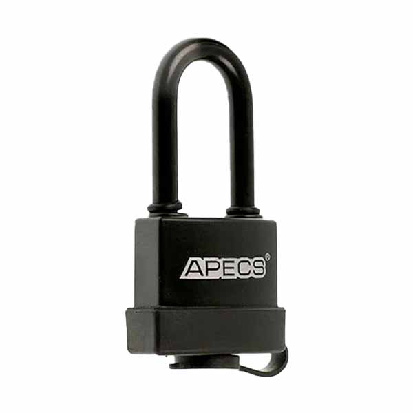 APECS PDR-50 LONG – навісний замок китайського виробництва. Чавунний корпус в пластиковому чохлі захищає від корозії, вологи та різних погодних умов. Дужка запирається з двох сторін, що підвищує захист від силового злому. Навколо дужки також знаходяться гумові кільця, які перешкоджають потраплянню вологи у замок. У цієї моделі є гумова заглушка , яка не дає потрапити пилу та бруду в серцевину замка. Має функція автоматичного замикання, внаслідок натискання на дужку. Завдяки довгій дужці можна використовувати на широко розставлених, або нерівних навісах.