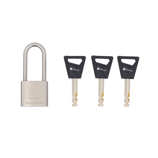 SHERLOCK 102-30 — чудовий варіант навісного замка для вуличного використання. Литий корпус виготовлений з нержавіючої сталі, тому стійкий до механічних пошкоджень та негоди.