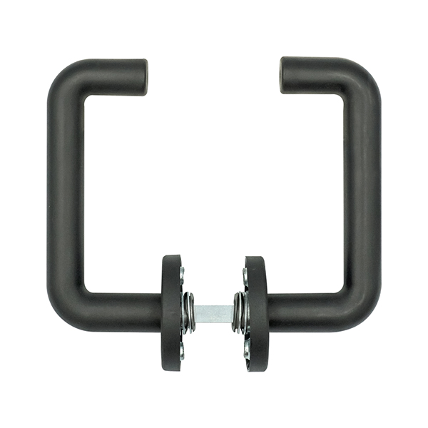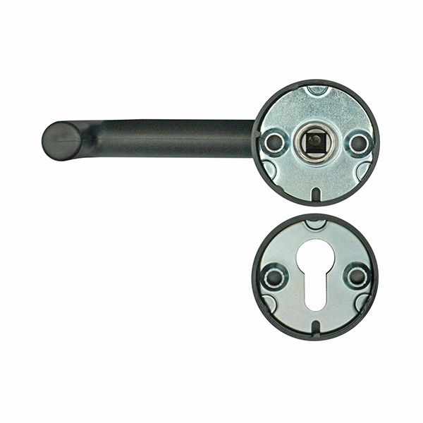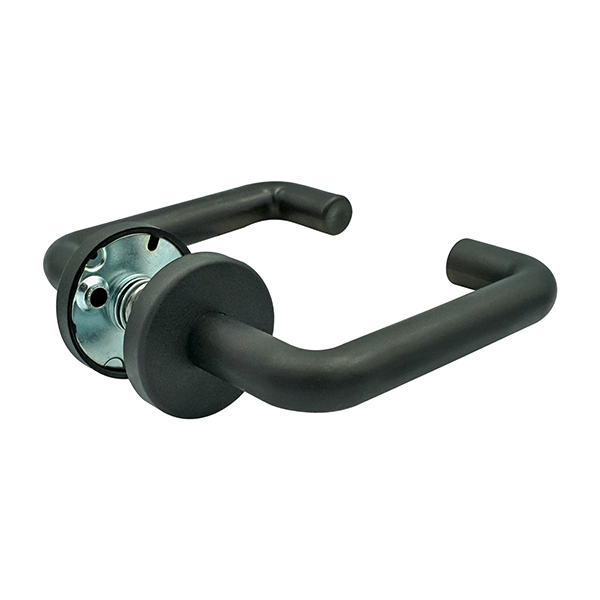 Особливістю конструкції є відсутність власної зворотньої пружини. Повернення ручки у вихідне положення забезпечується пружинним механізмом врізного протипожежного замка. Таке рішення підвищує загальну надійність системи, оскільки зменшує кількість механічних елементів, що можуть з часом вийти з ладу. Важливою перевагою моделі є її універсальність – ручки повністю симетричні та підходять як для лівостороннього, так і для правостороннього відкриття дверей.