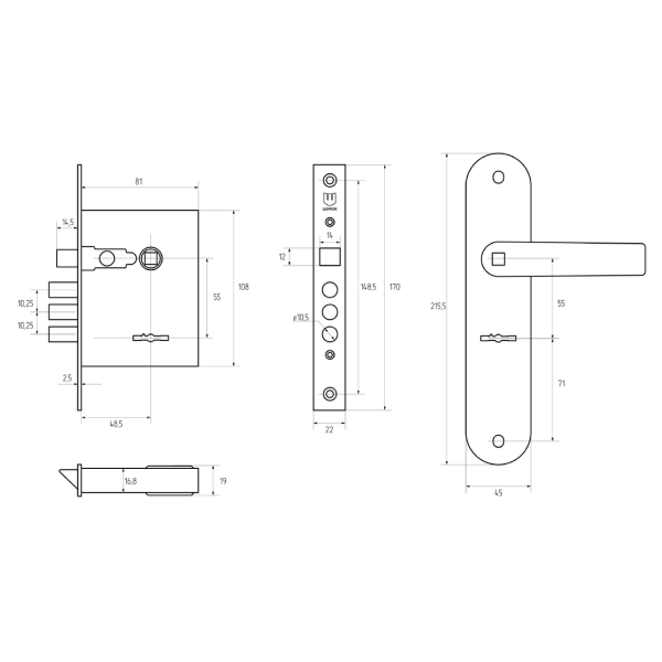 Закривання здійснюється 3-ма ригелями зі сталі діаметром 10,5 мм. Вони надійно фіксують двері, забезпечуючи достатній рівень безпеки. Язичок реверсивний, тому замок можна встановити як і на ліві, так і на праві двері. В даній версії в комплектації 3 ключа.