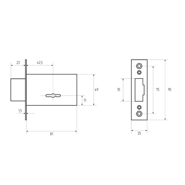 Закривання здійснюється одним прямокутним ригелем зі сталі. Він надійно фіксує двері, забезпечуючи достатній рівень безпеки. Повний вихід становить 23 мм. Даний замок ідеально підходить для встановлення в якості додаткового замка в металеві або дерев’яні двері квартир, будинків, гаражів чи комерційних приміщень. В даній версії в комплектації 3 ключа.