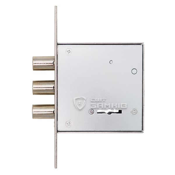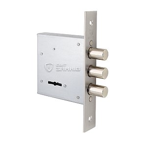 Закривання здійснюється 3-ма ригелями зі сталі діаметром 13,8 мм. Вони надійно фіксують двері, забезпечуючи достатній рівень безпеки. Повний вихід становить 20 мм. Даний замок ідеально підходить для встановлення в якості додаткового замка в металеві або дерев’яні двері квартир, будинків, гаражів чи комерційних приміщень. В даній версії в комплектації 5 ключів довжиною 90 мм.