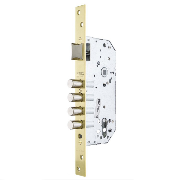 Фішкою даної моделі стали 4 сталеві ригелі діаметром 14 мм. Завдяки цьому в зачиненому виді вони надійно фіксуються в зворотній планці та забезпечують надійний захист. Тому його радять ставити в місцях де важлива безпека та зручність водночас. Повний вихід ригеля складає 20 мм. Зворотня планка в покритті "матова латунь" чудово впишеться в конструкцію дверей зі схожими відтінками. Замок підходить як для ліво, так і правосторонніх дверей.