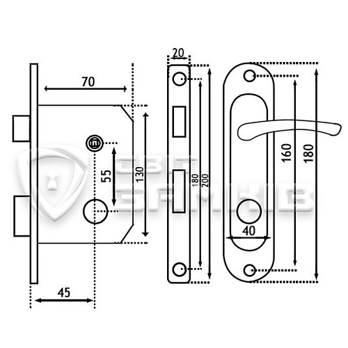 Замок врізний (968-45) з ручкою BRUNO (0528). Встановлюється на вхідні та міжкімнатні дерев’яні двері. Замок виготовлений із сталі, що забезпечує надійність та стійкість до корозії. Має язичок, який керується натисканням на ручку, а також один прямокутний ригель, який керується за допомогою серцевини. В комплекті серцевина відсутня, її потрібно підібрати окремо в залежності від товщини дверей та бажаного захисту. Додатково ручки на планці вкриті гальванічним покриттям.