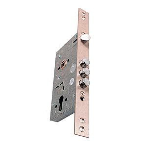 Даний механізм – це один із хороших варіантів для встановлення на металеві двері в даному класі.  Його перевагами є міцний масивний  корпус та надійний внутрішній механізм. Ригеля із каленої сталі та великого діаметру, їх важко перепилити чи забити. Опірний підшипник в ручці забезпечує плавний хід та довготривалу роботу, на відміну від пластикових втулок.