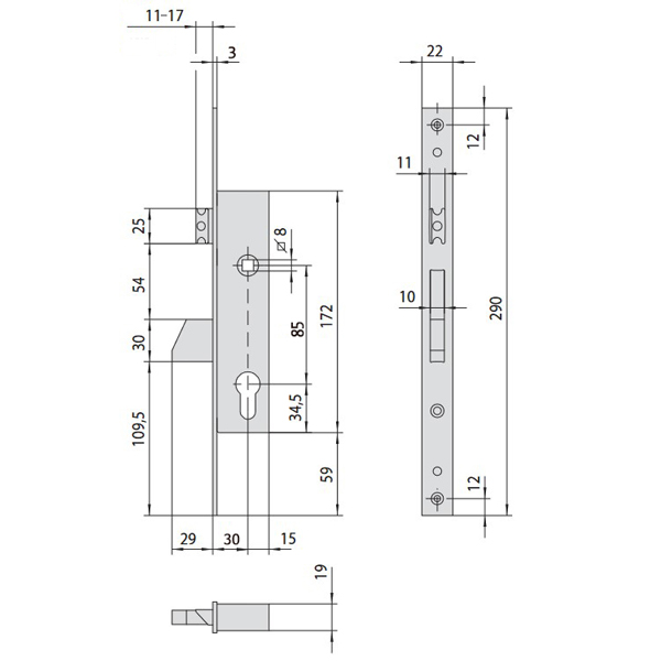 Опис Механізм замка CISA 46215.30 язичок (BS30*85мм, 22 мм) нержавіюча сталь