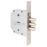 Основний замок який керується ручкою, сувальдним ключем та воротком нічної засувки. В моделі цього замка немає реверсивного язичка, тому підбирати слід його в залежності від сторонності дверей. Секрет вбудований в корпус. Не потребує комплектації серцевиною.