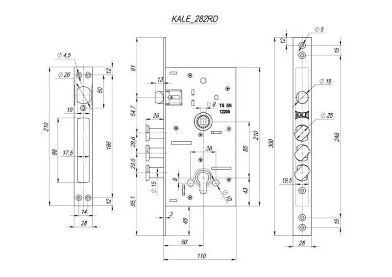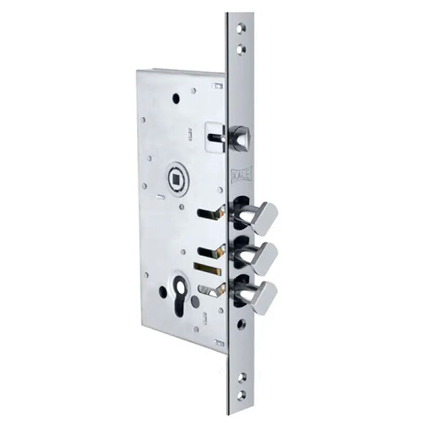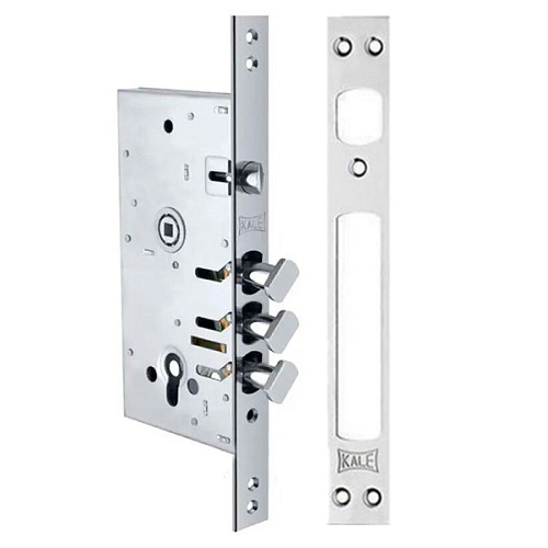 Дверна фурнітура турецької ТМ KALE є однією з найкращих по співвідношенню ціна/якість. Дана модель – це 3-х ригельний основний врізний замок. Особливістю являються спеціальні поворотні противіджимні ригелі діаметром 18мм і 25 мм на кінці. Завдяки цьому замок встановлюють на металеві двері з підвищеними вимогами до безпеки і взламостійкості. Повний вихід ригелів складає 26 мм. Керується ручками і серцевиною стандарту EURO DIN. Вона в комплект не входить та докуповується окремо в залежності від Ваших потреб. Завдяки реверсивному язичку підходить як для ліво, так і право-сторонніх дверей. Замок має отвори для кріплення протектора на серцевину.