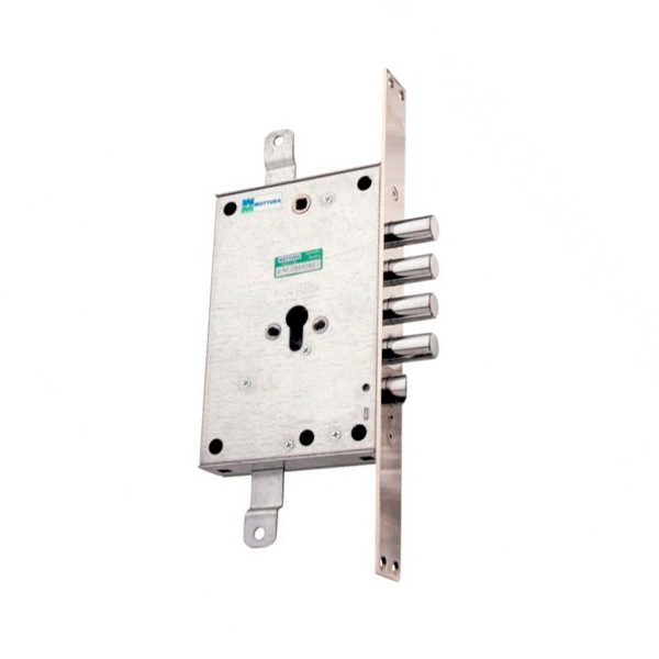 Замок для вхідних дверей Mottura 85.971 - це 4-х ригельний врізний замок для броньованих дверей під циліндр стандарту EURO DIN. Він керує 4-ма потужними сталевими ригелями діаметром 18 мм і язичком діаметром 20 мм .Монтується на металеві полотна товщиною від 60 мм в якості основного замка і керується ручкою. Особливістю даної моделі є запатентований механізм, який блокує рух ригелів при вибиванні циліндрового механізму. Замок має спеціальні “вуха” для кріплення тяг, які будуть зачиняти дверне полотно в двох додаткових точках.