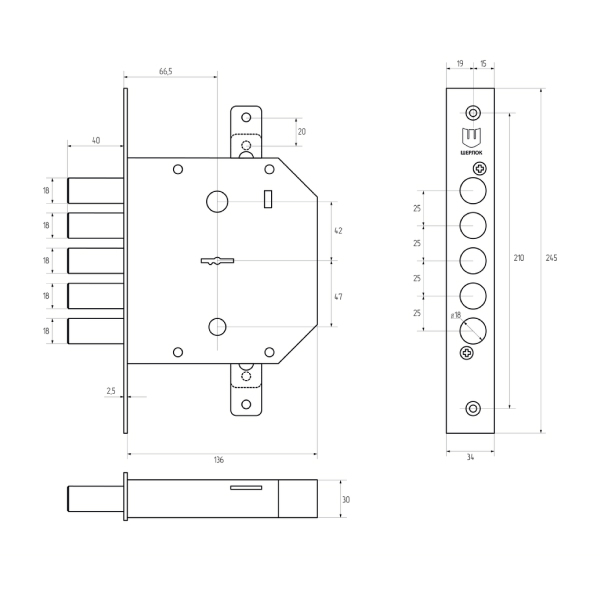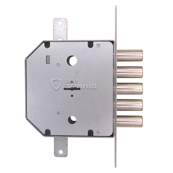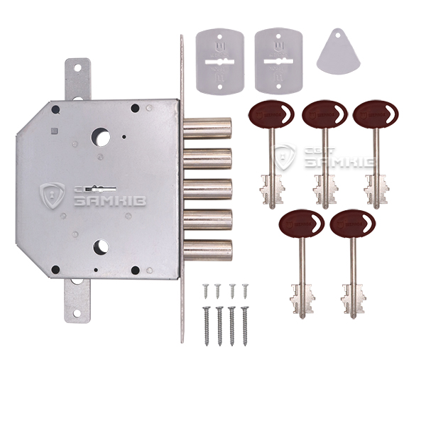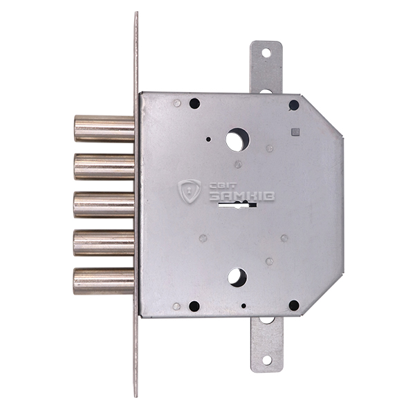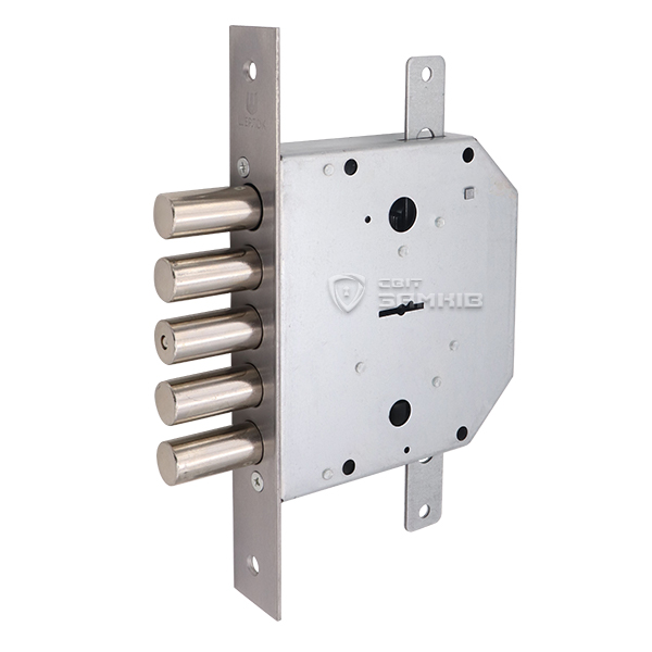 Замок має кріплення для тяг, тому замикання відбувається в три сторони. Підходить для правих і лівих дверей, так як язичок реверсивний. Після провертання ключа замикання відбувається 5-ма ригелями діаметром 18 мм з повним виходом 40 мм. В комплекті 5 ключів.