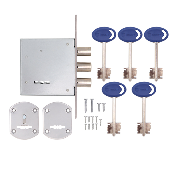 Закривання здійснюється 3-ма ригелями зі сталі діаметром 15,8 мм. Вони надійно фіксують двері, забезпечуючи достатній рівень безпеки. Повний вихід становить 26 мм. Даний замок ідеально підходить для встановлення в якості додаткового замка в металеві або дерев’яні двері квартир, будинків, гаражів чи комерційних приміщень. В даній версії в комплектації 5 ключів.