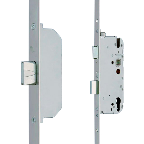 Німецький виробник G-U вже більше століття спеціалізується на випуску дверної та віконної фурнітури. Дана модель GU-Sec MR2 - це рейковий замок. Встановлюють його переважно на двері з профільного алюмінію. За рахунок рейки та встановлених на ній ригелів він має декілька точок запирання. Ця функція дуже важлива для такого типу дверей, тому що при зміні температури металопластиковий профіль починає "грати" та не прилягає щільно до рами. Верхній і нижній стальні ригелі допомагають фіксувати дверне полотно по всій висоті створки. Двері міцно прилягають та не пропускають повітря. Керування здійснюється за допомогою подвійного повороту ключа в серцевині на 360°. У результаті цього замикаючі елементи входять у свої зворотні планки і відбувається повне зачинення замка.