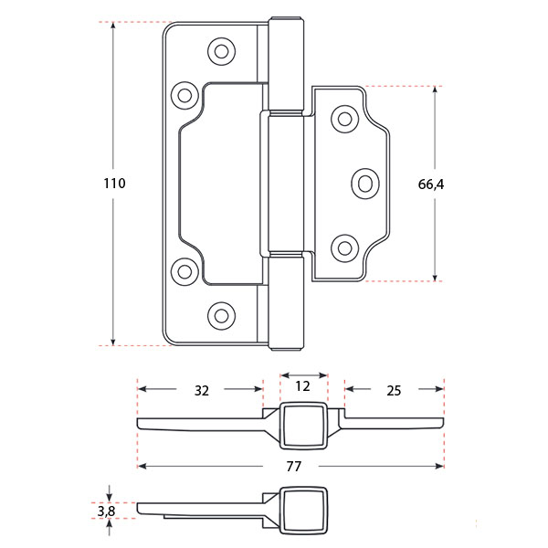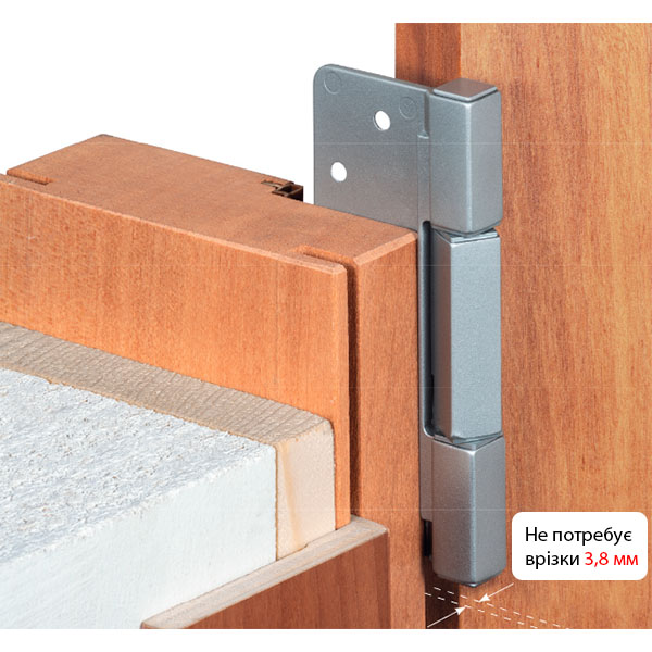Завіс має формат “метелика”. Це дає змогу змонувати його шляхом накладення на дверне полотно без потреби фрезерувати пази. В такому випадку щілина між дверима і коробкою буде становити до 3,8 мм. Фіксується шурупами, які йдуть у комплекті.