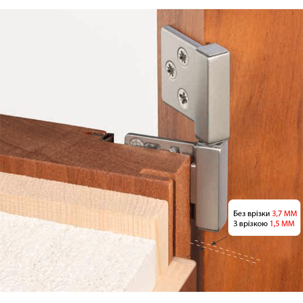 • Простий у монтажі: без врізання щілина між дверима і коробкою – 3,7 мм, з врізанням до 1,5 мм.