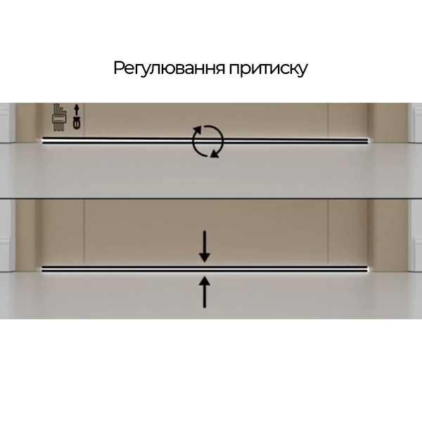 Данная модель имеет уменьшенный размер, поэтому удобно будет подстроить под любую толщину двери. Уплотнитель имеет один вид регулировки (винт F – опускание). Он управляет подвижным профилем с прокладкой (опускание со стороны петель и последующее постепенное опускание по всей длине), тем самым обеспечивая максимально сильное и равномерное прижимание по всей его длине. При этом важно помнить, что пространство между дверью и полом должно быть не больше, чем максимальная высота, на которую опускается порог.