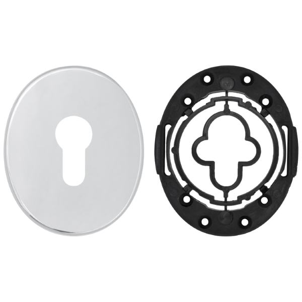 Крепится с внутренней стороны двери. Она позволяет скрыть монтажные отверстия, царапины и другие повреждения, которые могут появиться при установке замка и сердцевины. Изготовлен из стали, имеет овальную форму размером 85х70 мм. В цвете "хром полированный" лучше всего будет дополнять соответствующий цвет протектор и двери светлых оттенков. Монтаж производится довольно просто с помощью стяжных винтов.