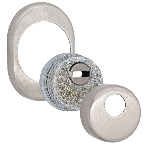 Для монтажа по диаметру протектора производится отверстие в дверном полотне. Крепится вокруг сердцевины стяжными винтами M6x40 мм, создавая монолитную конструкцию с ней. Винты изготовлены из специальной стали, которая помогает выдержать силу погрузки > 2300 кг на один винт. Таким образом, протектор защищает сердцевину вместе с точкой крепления в дверях от физических и силовых методов взлома – сверление, выламывание и выбивание. Доступа к винтам крепления нет, поэтому сорвать саму броненакладку очень сложно. Высота (или толщина) составляет 25 мм, диаметр – 50 мм. В цвете "никель матовый" лучше всего будет дополнять двери светлых оттенков.