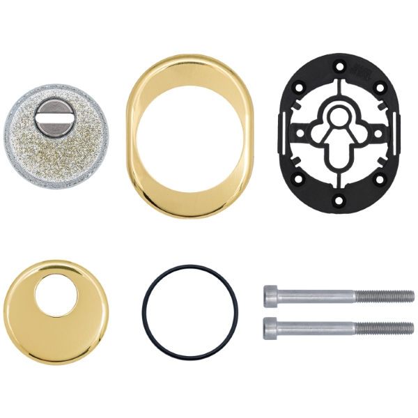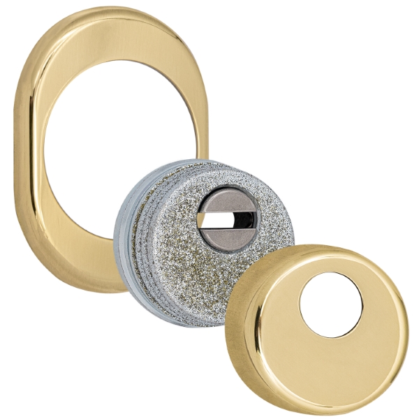 Для монтажа по диаметру протектора производится отверстие в дверном полотне. Крепится вокруг сердцевины стяжными винтами M6x40 мм, создавая монолитную конструкцию с ней. Винты изготовлены из специальной стали, которая помогает выдержать силу погрузки > 2300 кг на один винт. Таким образом, протектор защищает сердцевину вместе с точкой крепления в дверях от физических и силовых методов взлома – сверление, выламывание и выбивание. Доступа к винтам крепления нет, поэтому сорвать саму броненакладку очень сложно. Высота (или толщина) составляет 25 мм, диаметр – 50 мм. В цвете "латунь полированная" лучше всего будет дополнять двери светлых оттенков.