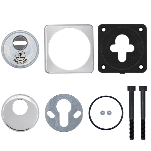 Для монтажа по диаметру тела протектора производится отверстие в дверном полотне. Крепится вокруг сердцевины стяжными винтами M6x40 мм, создавая монолитную конструкцию с ней. Винты изготовлены из специальной стали, которая помогает выдержать силу погрузки > 2300 кг на один винт. Таким образом, протектор защищает сердцевину вместе с точкой крепления в дверях от физических и силовых методов взлома. Высота (или толщина) составляет 25 мм, диаметр – 50 мм. В цвете "хром полированный" лучше всего будет дополнять двери светлых оттенков.