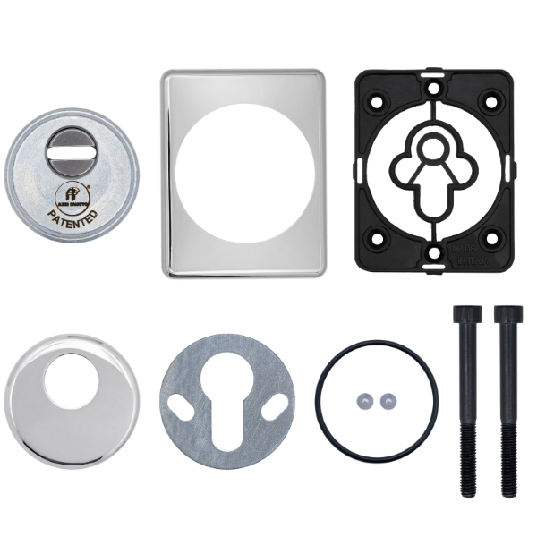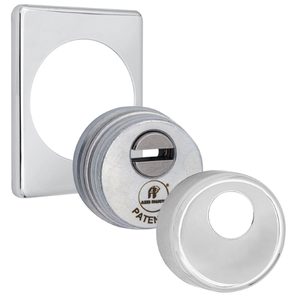 Для монтажа по диаметру тела протектора производится отверстие в дверном полотне. Крепится вокруг сердцевины стяжными винтами M6x40 мм, создавая монолитную конструкцию с ней. Винты изготовлены из специальной стали, которая помогает выдержать силу погрузки > 2300 кг на один винт. Таким образом, протектор защищает сердцевину вместе с точкой крепления в дверях от физических и силовых методов взлома. Высота (или толщина) составляет 25 мм, диаметр – 50 мм. В цвете "хром полированный" лучше всего будет дополнять двери светлых оттенков.