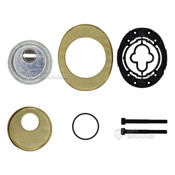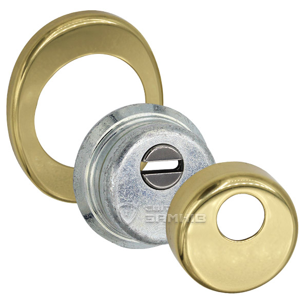 Для монтажа по диаметру протектора делается отверстие в дверном полотне. Крепится вокруг сердцевины стяжными винтами, создавая монолитную конструкцию с ней. Таким образом, протектор защищает ее вместе с точкой крепления в дверях от физических и силовых методов взлома - сверления, взлома и выбивания. Доступа к винтам крепления нет и сорвать саму броненакладку чрезвычайно сложно. Высота (или толщина) ее составляет 25 мм, диаметр - 50 мм. Комплектуется декоративной накладкой размером 85х70 мм для предоставления дверному полотну более опрятного вида. В цвете "полированная латунь" лучше будет дополнять двери светлых оттенков.