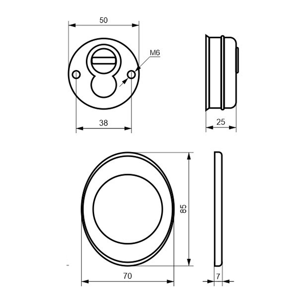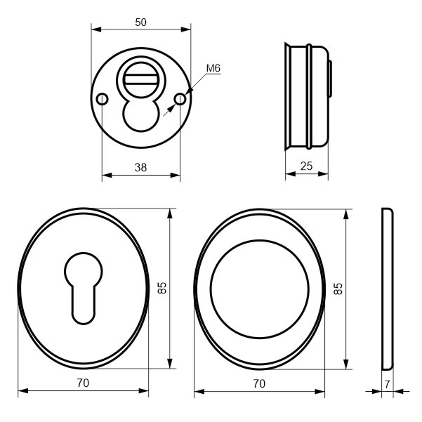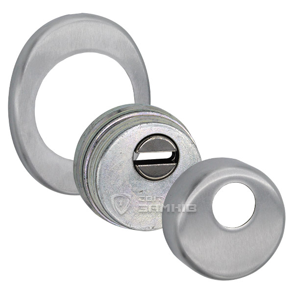 Для монтажа по диаметру протектора делается отверстие в дверном полотне. Крепится вокруг сердцевины стяжными винтами, создавая монолитную конструкцию с ней. Таким образом, протектор защищает ее вместе с точкой крепления в дверях от физических и силовых методов взлома - сверления, взлома и выбивания. Доступа к винтам крепления нет и сорвать саму броненакладку чрезвычайно сложно. Высота (или толщина) ее составляет 25/33 мм, диаметр - 50 мм. Комплектуется декоративной накладкой размером 85х70 мм для предоставления дверному полотну более опрятного вида. В цвете "матовый хром" лучше будет дополнять двери светлых оттенков - от тепло-серых до бежевых.