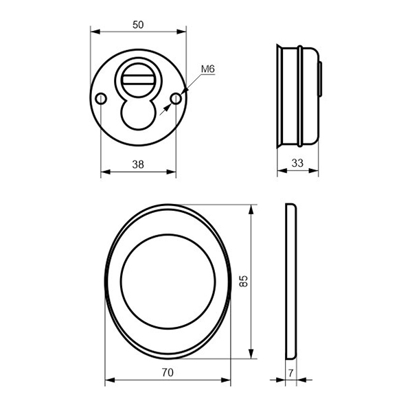Для монтажа по диаметру протектора делается отверстие в дверном полотне. Крепится вокруг сердцевины стяжными винтами, создавая монолитную конструкцию с ней. Таким образом, протектор защищает ее вместе с точкой крепления в дверях от физических и силовых методов взлома - сверления, взлома и выбивания. Доступа к винтам крепления нет и сорвать саму броненакладку чрезвычайно сложно. Высота (или толщина) ее составляет 25/33 мм, диаметр - 50 мм. Комплектуется декоративной накладкой размером 85х70 мм для предоставления дверному полотну более опрятного вида. В бронзовом цвете лучше будет дополнять двери с пыльно-землистой палитры.