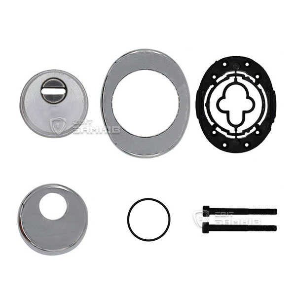 Для монтажа по диаметру протектора делается отверстие в дверном полотне. Крепится вокруг сердцевины стяжными винтами, создавая монолитную конструкцию с ней. Таким образом, протектор защищает ее вместе с точкой крепления в дверях от физических и силовых методов взлома - сверления, взлома и выбивания. Доступа к винтам крепления нет и сорвать саму броненакладку чрезвычайно сложно. Высота (или толщина) ее составляет 25/33 мм, диаметр - 50 мм. Комплектуется декоративной накладкой размером 85х70 мм для предоставления дверному полотну более опрятного вида. В цвете "хром" лучше будет дополнять двери светлых оттенков - от тепло-серых до бежевых.
