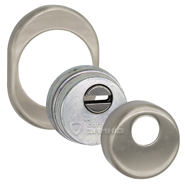 Для монтажа по диаметру протектора делается отверстие в дверном полотне. Крепится вокруг сердцевины стяжными винтами, создавая монолитную конструкцию с ней. Таким образом, протектор защищает ее вместе с точкой крепления в дверях от физических и силовых методов взлома - сверления, взлома и выбивания. Доступа к винтам крепления нет и сорвать саму броненакладку чрезвычайно сложно. Высота (или толщина) ее составляет 25/33 мм, диаметр - 50 мм. В цвете "никель сатин" лучше будет дополнять двери светлых оттенков - от тепло-серых до бежевых.