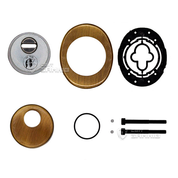Для монтажа по диаметру протектора делается отверстие в дверном полотне. Крепится вокруг сердцевины стяжными винтами, создавая монолитную конструкцию с ней. Таким образом, протектор защищает ее вместе с точкой крепления в дверях от физических и силовых методов взлома - сверления, взлома и выбивания. Доступа к винтам крепления нет и сорвать саму броненакладку чрезвычайно сложно. Высота (или толщина) ее составляет 25 мм, диаметр - 50 мм. Комплектуется декоративной накладкой размером 85х70 мм для предоставления дверному полотну более опрятного вида. В бронзовом цвете лучше будет дополнять двери с пыльно-землистой палитры.