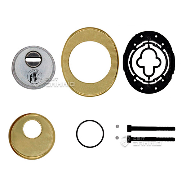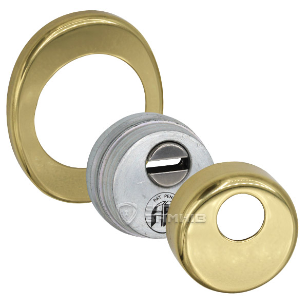 Для монтажа по диаметру протектора делается отверстие в дверном полотне. Крепится вокруг сердцевины стяжными винтами, создавая монолитную конструкцию с ней. Таким образом, протектор защищает ее вместе с точкой крепления в дверях от физических и силовых методов взлома - сверления, взлома и выбивания. Доступа к винтам крепления нет и сорвать саму броненакладку чрезвычайно сложно. Высота (или толщина) ее составляет 25 мм, диаметр - 50 мм. Комплектуется декоративной накладкой размером 85х70 мм для предоставления дверному полотну более опрятного вида. В цвете "полированная латунь" лучше будет дополнять двери светлых оттенков.