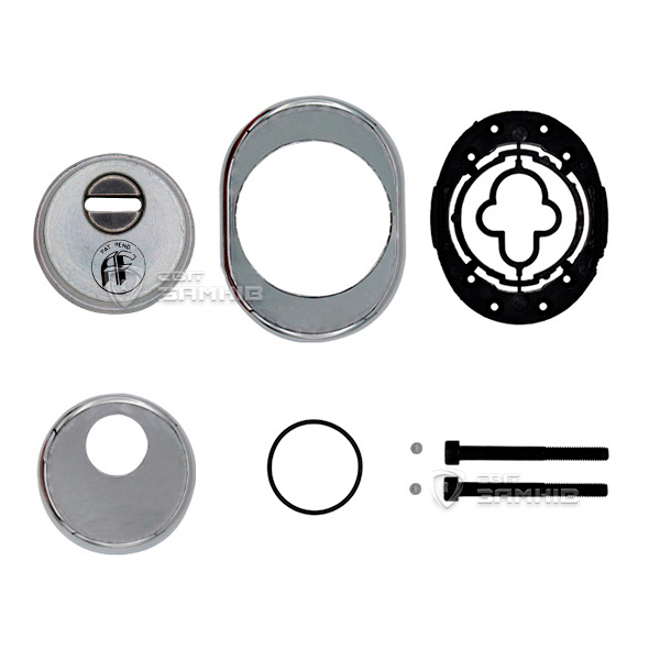 Для монтажа по диаметру протектора делается отверстие в дверном полотне. Крепится вокруг сердцевины стяжными винтами, создавая монолитную конструкцию с ней. Таким образом, протектор защищает ее вместе с точкой крепления в дверях от физических и силовых методов взлома - сверления, взлома и выбивания. Доступа к винтам крепления нет и сорвать саму броненакладку чрезвычайно сложно. Высота (или толщина) ее составляет 25 мм, диаметр - 50 мм. В цвете "хром" лучше будет дополнять двери светлых оттенков - от тепло-серых до бежевых.