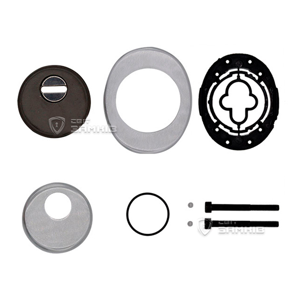 Для монтажа по диаметру протектора делается отверстие в дверном полотне. Крепится вокруг сердцевины стяжными винтами, создавая монолитную конструкцию с ней. Таким образом, протектор защищает ее вместе с точкой крепления в дверях от физических и силовых методов взлома - сверления, взлома и выбивания. Доступа к винтам крепления нет и сорвать саму броненакладку чрезвычайно сложно. Высота (или толщина) ее составляет 25 мм, диаметр - 50 мм. Комплектуется декоративной накладкой размером 85х70 мм для предоставления дверному полотну более опрятного вида. В цвете "матовый хром" лучше будет дополнять двери светлых оттенков - от тепло-серых до бежевых.