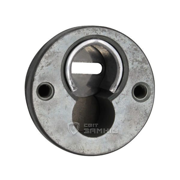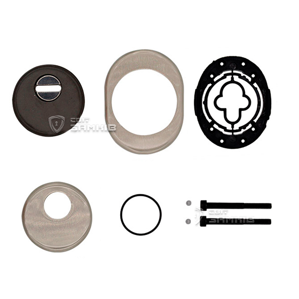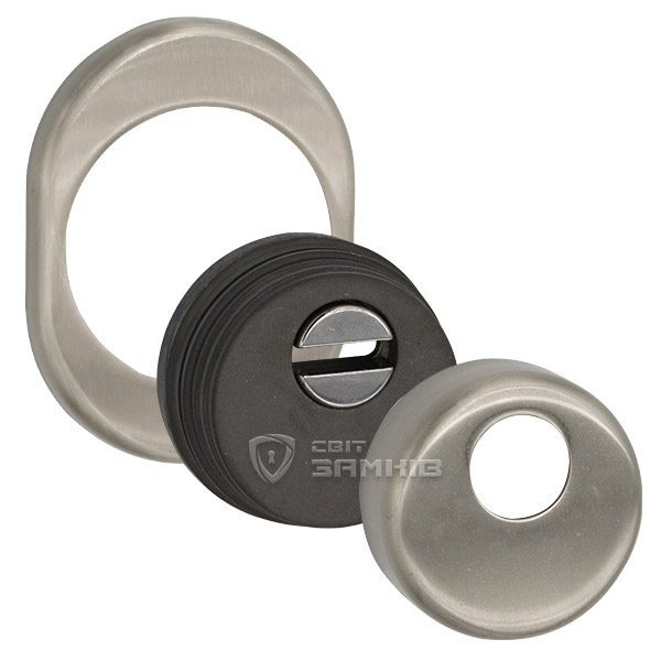 Для монтажа по диаметру протектора делается отверстие в дверном полотне. Крепится вокруг сердцевины стяжными винтами, создавая монолитную конструкцию с ней. Таким образом, протектор защищает ее вместе с точкой крепления в дверях от физических и силовых методов взлома - сверления, взлома и выбивания. Доступа к винтам крепления нет и сорвать саму броненакладку чрезвычайно сложно. Высота (или толщина) ее составляет 25 мм, диаметр - 50 мм. В цвете "никель сатин" лучше будет дополнять двери светлых оттенков - от тепло-серых до бежевых.