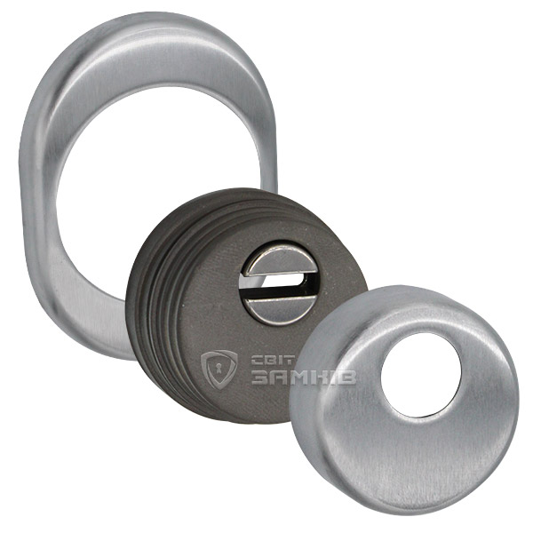 Для монтажа по диаметру протектора делается отверстие в дверном полотне. Крепится вокруг сердцевины стяжными винтами, создавая монолитную конструкцию с ней. Таким образом, протектор защищает ее вместе с точкой крепления в дверях от физических и силовых методов взлома - сверления, взлома и выбивания. Доступа к винтам крепления нет и сорвать саму броненакладку чрезвычайно сложно. Высота (или толщина) ее составляет 25/33 мм, диаметр - 50 мм. В цвете "матовый хром" лучше будет дополнять двери светлых оттенков - от тепло-серых до бежевых.