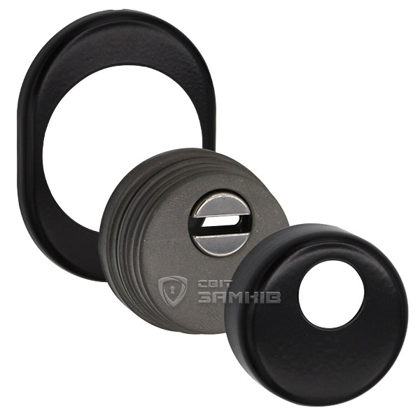 Для монтажа по диаметру протектора делается отверстие в дверном полотне. Крепится вокруг сердцевины стяжными винтами, создавая монолитную конструкцию с ней. Таким образом, протектор защищает ее вместе с точкой крепления в дверях от физических и силовых методов взлома - сверления, взлома и выбивания. Доступа к винтам крепления нет и сорвать саму броненакладку чрезвычайно сложно. Высота (или толщина) ее составляет 25/33 мм, диаметр - 50 мм. В черном цвете лучше будет дополнять двери аналогичных оттенков для того, чтобы максимально избежать контрастов и не привлекать лишнего внимания.