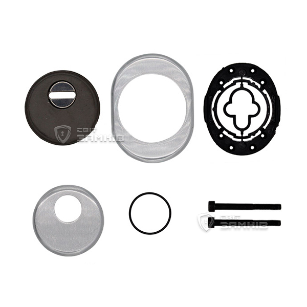 Для монтажа по диаметру протектора делается отверстие в дверном полотне. Крепится вокруг сердцевины стяжными винтами, создавая монолитную конструкцию с ней. Таким образом, протектор защищает ее вместе с точкой крепления в дверях от физических и силовых методов взлома - сверления, взлома и выбивания. Доступа к винтам крепления нет и сорвать саму броненакладку чрезвычайно сложно. Высота (или толщина) ее составляет 25/33 мм, диаметр - 50 мм. В цвете "матовый хром" лучше будет дополнять двери светлых оттенков - от тепло-серых до бежевых.