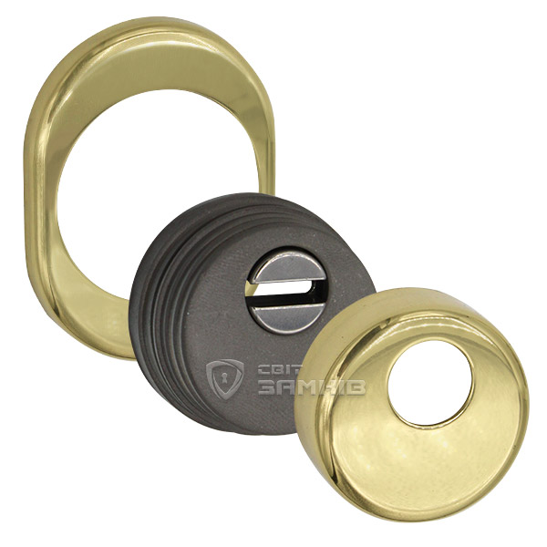 Для монтажа по диаметру протектора делается отверстие в дверном полотне. Крепится вокруг сердцевины стяжными винтами, создавая монолитную конструкцию с ней. Таким образом, протектор защищает ее вместе с точкой крепления в дверях от физических и силовых методов взлома - сверления, взлома и выбивания. Доступа к винтам крепления нет и сорвать саму броненакладку чрезвычайно сложно. Высота (или толщина) ее составляет 25/33 мм, диаметр - 50 мм. В цвете "полированная латунь" лучше будет дополнять двери светлых оттенков.