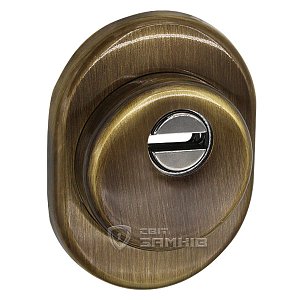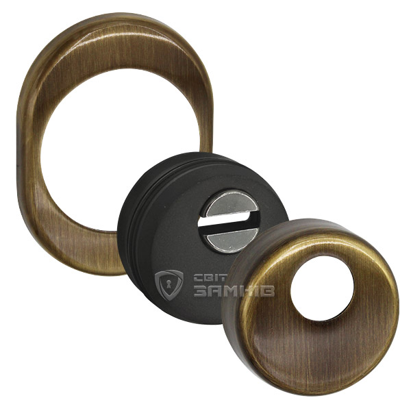 Для монтажа по диаметру протектора делается отверстие в дверном полотне. Крепится вокруг сердцевины стяжными винтами, создавая монолитную конструкцию с ней. Таким образом, протектор защищает ее вместе с точкой крепления в дверях от физических и силовых методов взлома - сверления, взлома и выбивания. Доступа к винтам крепления нет и сорвать саму броненакладку чрезвычайно сложно. Высота (или толщина) ее составляет 26,5 мм, диаметр - 50 мм. В бронзовом цвете лучше будет дополнять двери с пыльно-землистой палитры.