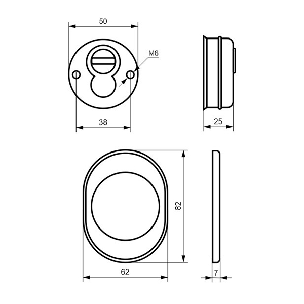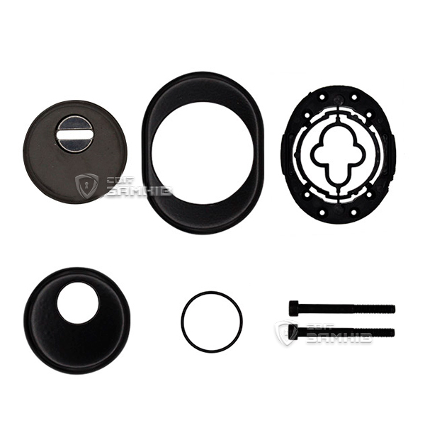 Для монтажа по диаметру протектора делается отверстие в дверном полотне. Крепится вокруг сердцевины стяжными винтами, создавая монолитную конструкцию с ней. Таким образом, протектор защищает ее вместе с точкой крепления в дверях от физических и силовых методов взлома - сверления, взлома и выбивания. Доступа к винтам крепления нет и сорвать саму броненакладку чрезвычайно сложно. Высота (или толщина) ее составляет 26,5 мм, диаметр - 50 мм. В черном цвете лучше будет дополнять двери аналогичных оттенков для того, чтобы максимально избежать контрастов и не привлекать лишнего внимания.